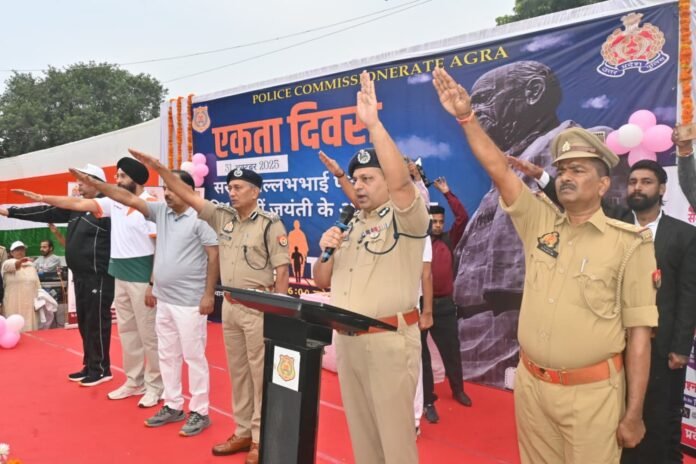 आगरा। “एक राष्ट्र, एक संकल्प, एक पहचान—भारत” के संदेश के साथ शुक्रवार को पूरी ताजनगरी राष्ट्रीय एकता दिवस के रंग में सराबोर दिखाई दी। लौह पुरुष सरदार वल्लभभाई पटेल की 150वीं जयंती के अवसर पर आयोजित इस भव्य कार्यक्रम में पुलिस कमिश्नरेट आगरा के नेतृत्व में हजारों लोगों ने भाग लिया।कार्यक्रम की शुरुआत अमर सिंह गेट, आगरा फोर्ट पर स्थित सरदार पटेल की प्रतिमा पर माल्यार्पण के साथ हुई। पुलिस आयुक्त दीपक कुमार (IPS) और भारतीय हॉकी टीम के पूर्व कप्तान व ओलंपियन जगवीर सिंह ने पुष्प अर्पित कर सरदार पटेल को श्रद्धांजलि दी। इसके बाद उपस्थित पुलिस अधिकारियों, छात्र-छात्राओं, डॉक्टरों और गणमान्य नागरिकों को राष्ट्र की एकता, अखंडता और समरसता की शपथ दिलाई गई।