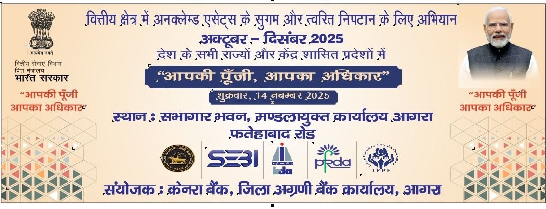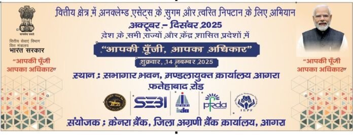 आगरा। ताजनगरी में अब उन लाखों बैंक खाताधारकों के लिए बड़ी राहत की खबर है, जिनके खाते पिछले दस वर्षों से निष्क्रिय हैं। डीएफएस (वित्तीय सेवा विभाग), वित्त मंत्रालय भारत सरकार और भारतीय रिजर्व बैंक (RBI) के तत्वावधान में आगामी 14 नवंबर 2025 को मंडलायुक्त सभागार, आगरा में एक विशेष बैंक समाधान शिविर आयोजित किया जाएगा।लीड डिस्ट्रिक्ट मैनेजर (LDM) केनरा बैंक, श्री ऋषिकेश बनर्जी ने जानकारी दी कि इस शिविर में पिछले दस वर्षों से निष्क्रिय चल रहे 22 बैंकों के 7.82 लाख खातों में पड़ी ₹240.86 करोड़ की डंप राशि का निस्तारण किया जाएगा। इसके लिए सभी राष्ट्रीयकृत और निजी बैंकों के समाधान स्टॉल लगाए जाएंगे, जहां खाताधारक सीधे संपर्क कर अपनी निष्क्रिय राशि वापस प्राप्त कर सकेंगे।