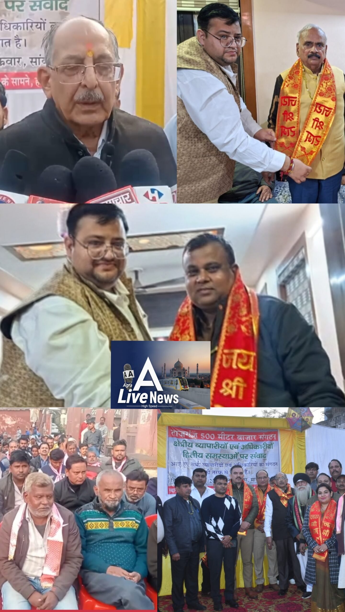 आगरा लाईव न्यूज। ताजगंज 500 मीटर बाजार संगठन की ओर से द्वितीय व्यापारी–अधिकारी संवाद कार्यक्रम का आयोजन ताजगंज स्थित चौक कागजीयान पर किया गया। कार्यक्रम में ताजगंज 500 मीटर क्षेत्र से जुड़ी ज्वलंत समस्याओं को लेकर व्यापारियों और प्रशासनिक अधिकारियों के बीच खुलकर संवाद हुआ। इस दौरान क्षेत्रीय विकास, मूलभूत सुविधाओं और लंबे समय से लंबित कार्यों पर गंभीर मंथन किया गया। कार्यक्रम का शुभारंभ अपर आयुक्त अशोक प्रिय गौतम, जेडएसओ महेंद्र सिंह, पुलिस क्राइम इंस्पेक्टर एवं उपनिरीक्षक अमित थामा, उत्तर प्रदेश व्यापार मंडल के प्रदेश अध्यक्ष वीएस गुप्ता, आगरा महानगर अध्यक्ष राहुल वर्मा, प्रवक्ता अमित गुप्ता एवं ताजगंज 500 मीटर बाजार संगठन के अध्यक्ष कृष्ण मुरारी अग्रवाल ने संयुक्त रूप से किया।