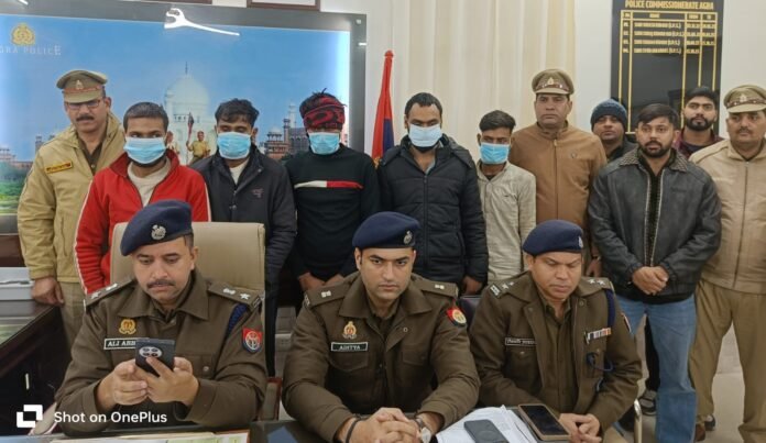 आगरा लाईव न्यूज। महज 20 घंटे के भीतर झूठे अपहरण की कहानी का पर्दाफाश करते हुए मुंबई के एक व्यापारी से रुपये और सामान लूटने वाले पांच आरोपियों को गिरफ्तार कर लिया है। पुलिस जांच में साफ हो गया कि अपहरण की घटना पूरी तरह फर्जी थी और वादी स्वयं आरोपियों के संपर्क में था। 08 जनवरी 2026 को वादी ने थाना एत्माद्दौला में सूचना दी कि वह 06 जनवरी को अपने काम से आगरा आया था और उसका आगरा आना-जाना पहले से होता रहता है। 07 जनवरी को उसे दिल्ली में रहने वाले एक दोस्त का फोन आया, जिसने मिलने के लिए उसे रामबाग चौराहे पर बुलाया। रामबाग चौराहे पर वादी पुड़ी खा रहा था, तभी एक कार से दो युवक आए और उसे गाड़ी में बैठने को कहा। वादी को लगा कि ये लोग उसके दोस्त द्वारा भेजे गए हैं, इसी भ्रम में वह उनके साथ कार में बैठ गया। इसके बाद आरोपी उसे शहर से बाहर खंदौली की ओर एक सुनसान जगह पर ले गए, जहां अन्य साथियों के साथ मिलकर उसके साथ गाली-गलौच और मारपीट की गई तथा जान से मारने की धमकी देकर उसका मोबाइल फोन, कुछ नकदी, एक सोने की अंगूठी और ऑनलाइन माध्यम से करीब दो लाख रुपये अपने खाते में ट्रांसफर करा लिए गए।