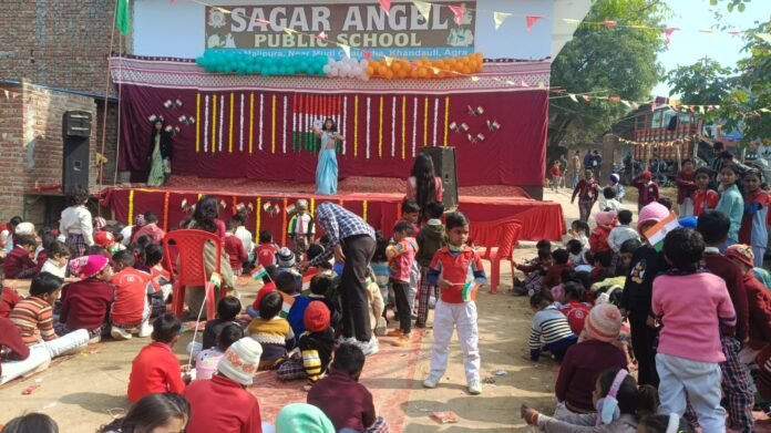 आगरा लाईव (खंदौली)। 77वें गणतंत्र दिवस के पावन अवसर पर सागर एंजेल पब्लिक स्कूल, ग्राम मलीपुरा, मुड़ी चौराहा, खंदौली, आगरा में देशभक्ति, उत्साह और उल्लास के साथ भव्य कार्यक्रम आयोजित किया गया। विद्यालय परिसर को तिरंगे के रंगों से सजाया गया, जिससे वातावरण पूरी तरह राष्ट्रभक्ति से सराबोर नजर आया। कार्यक्रम की शुरुआत मुख्य अतिथि खंदौली ब्लॉक प्रमुख आशीष शर्मा द्वारा ध्वजारोहण के साथ हुई। ध्वज फहराते ही पूरे परिसर में राष्ट्रगान गूंज उठा और उपस्थित लोगों ने तिरंगे को सलामी दी।