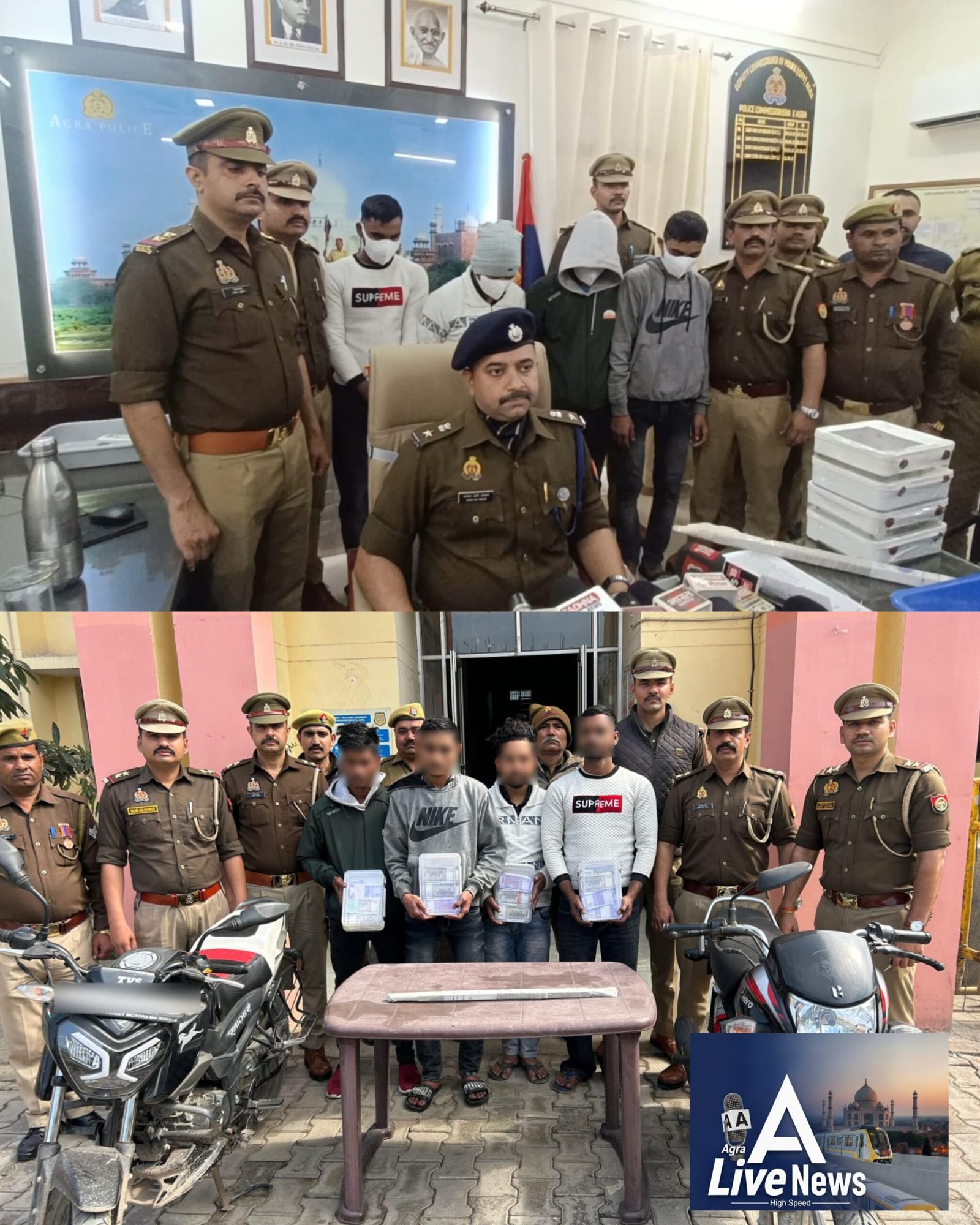 आगरा लाईव। थाना नाई की मंडी पुलिस टीम और सर्विलांस/एसओजी नगर जोन की संयुक्त कार्रवाई में एमजी रोड स्थित चिराग फुटवियर फर्म में हुई लाखों की चोरी की घटना का सफल अनावरण कर लिया गया है। पुलिस ने इस मामले में चार अभियुक्तों को गिरफ्तार करते हुए उनके कब्जे से चोरी के 6 लाख 57 हजार 500 रुपये नकद, घटना में प्रयुक्त दो मोटरसाइकिलें और एक लोहे का सब्बल बरामद किया है, जबकि एक अभियुक्त अंधेरे का फायदा उठाकर फरार हो गया। पुलिस के अनुसार, 2 फरवरी 2026 को दुकान मालिक ने थाना नाई की मंडी पर सूचना दी थी कि उनकी दुकान डाकरान, एमजी रोड पर स्थित है। 31 जनवरी की रात वह दुकान बंद कर घर चले गए थे। 2 फरवरी की सुबह जब दुकान खोली तो गल्ले के ताले टूटे मिले और छत का गेट भी क्षतिग्रस्त था। जांच करने पर पता चला कि चोरों ने गल्ले से लगभग 11 लाख रुपये चोरी कर लिए हैं।
